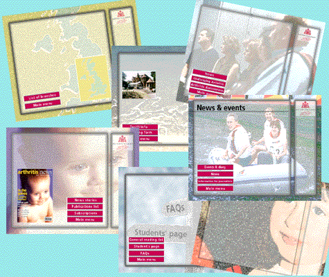 Screen designs in progress. The screens shown below are the introductory interfaces for the various services supplied by Arthritis Care. The site has been designed to deliver quality information to people with arthritis; most of the pages will be text only, with buttons in the housestyle colour as links.
